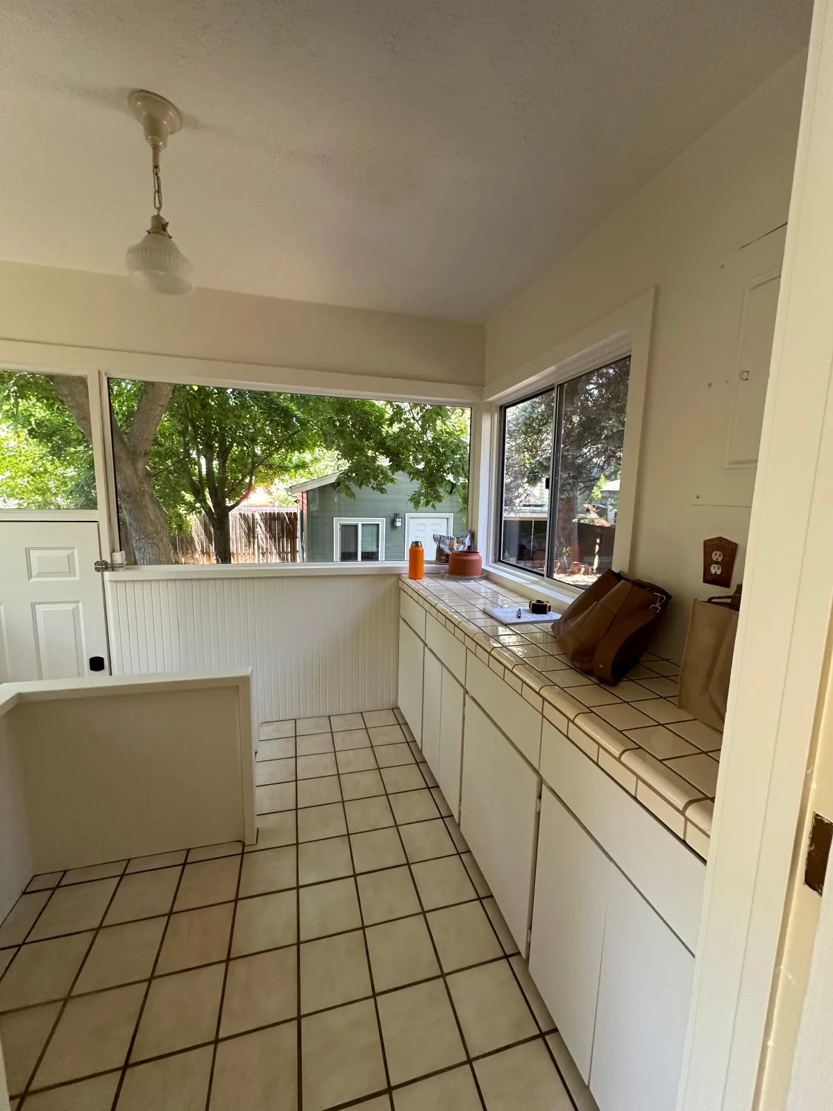 The doorway into the kitchen from the dining space and also from the back entry were positioned in such a way that the current set up was likely one of the few ways it could work. However, moving those doorways a bit would completely change the space and allow for a galley-style kitchen, maximizing storage and the much-needed expansion of the work triangle.