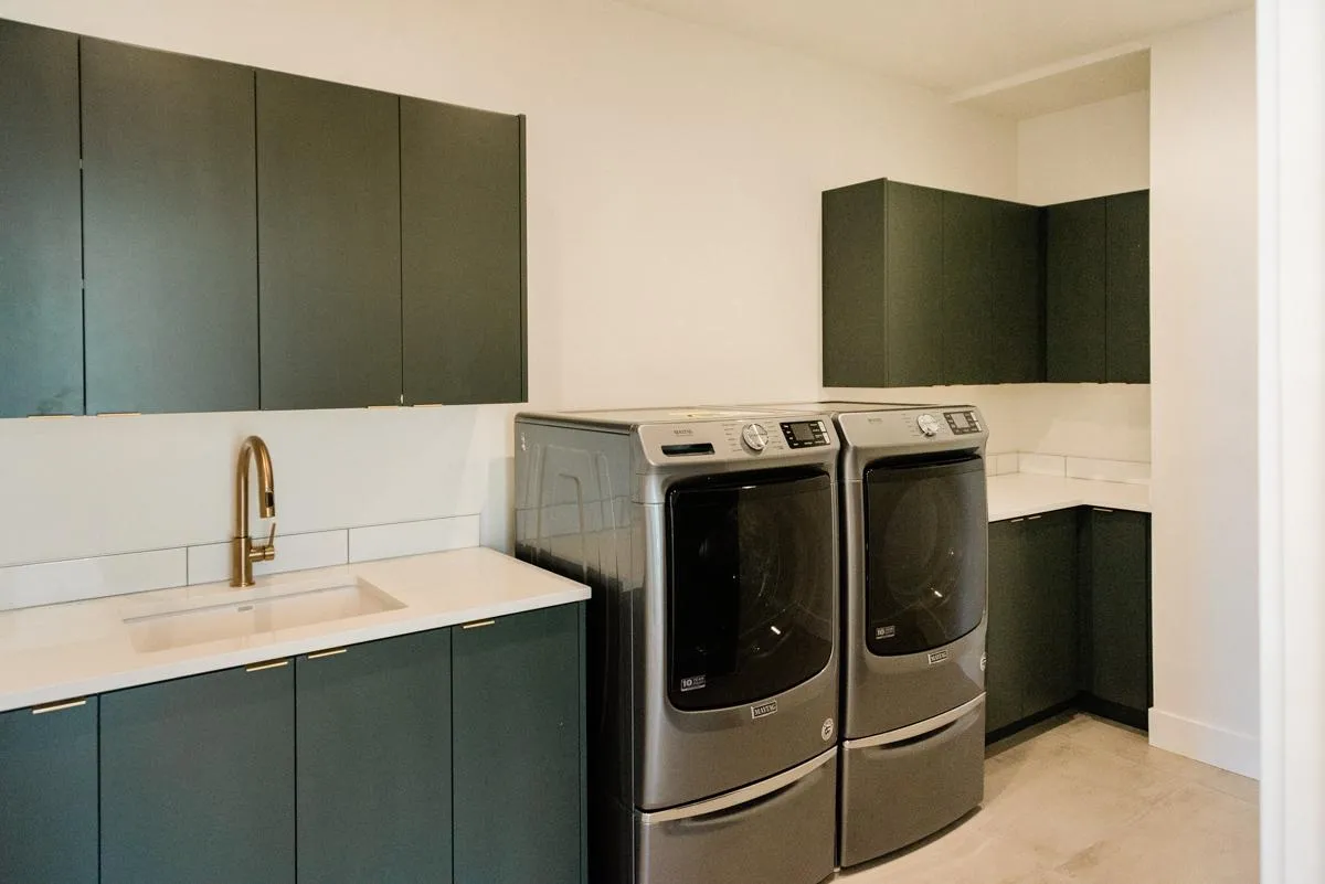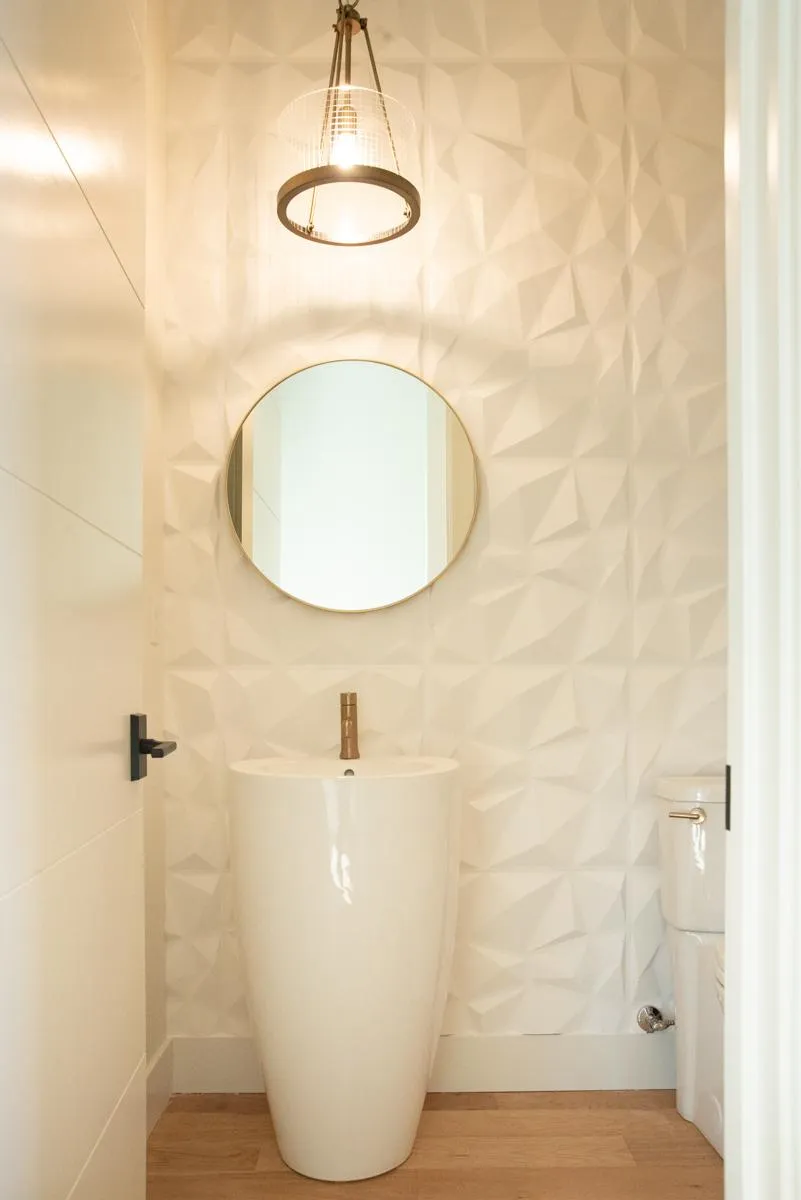 The goal was to create a contemporary space that reflected their style while staying mindful of budget. We used a mix of materials like gold, chrome, marble, and wood finishes to create a chic, yet cozy atmosphere. One of my favorite details was the powder bath, where we added a 3D textured wallpaper on the back wall, paired with a sleek, freestanding pedestal sink and a pendant light for a bold, modern look. The home itself had a unique three-story floor plan, with the garage on the bottom and the living space on the top floor, so creating cohesion between the spaces was key. The kitchen, with its beautiful natural light and mix of materials, was my absolute favorite part of the home for the longest time. It was such a joy to work on this project, and I loved seeing it come together as a truly unique space that reflected my clients’ vision.